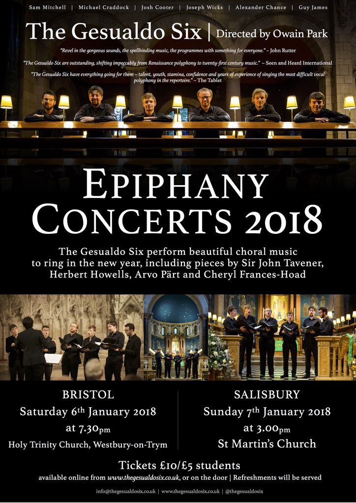 We are looking forward to ringing in the first weekend of the new year with performances in Bristol and Salisbury. On Saturday 6 January 2018, we return to Holy Trinity Church in Westbury-on-Trym to conclude their 1300th anniversary celebrations. We then travel to Salisbury to perform for the third time in St Martin’s Church. Both programmes are centred around music for Epiphany, and will feature renaissance and contemporary works intermingled with plainchant. Featured composers include Sir John Tavener, Herbert Howells, Arvo Pärt and Cheryl Frances-Hoad. Tickets are just £10, with a £5 reduced rate for students.